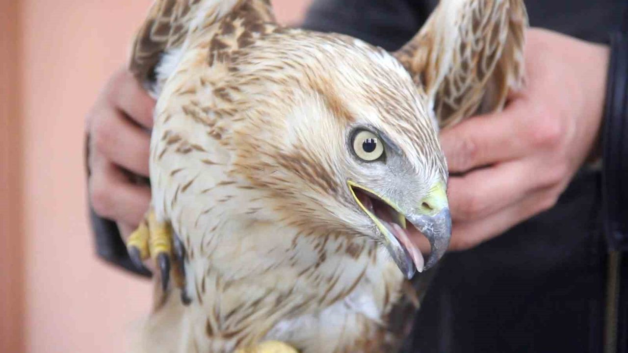 Sivas'ın Zara ilçesinde bitkin halde bulunan kızıl şahin, Doğa Koruma ve Milli Parklar ekiplerine teslim edildi.