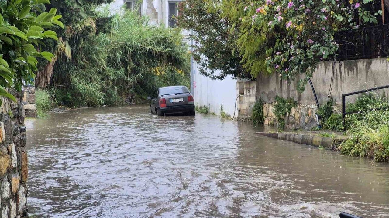Muğla’nın Bodrum ilçesinde etkili olan sağanak yağış nedeniyle araçlar derede mahsur kaldı.