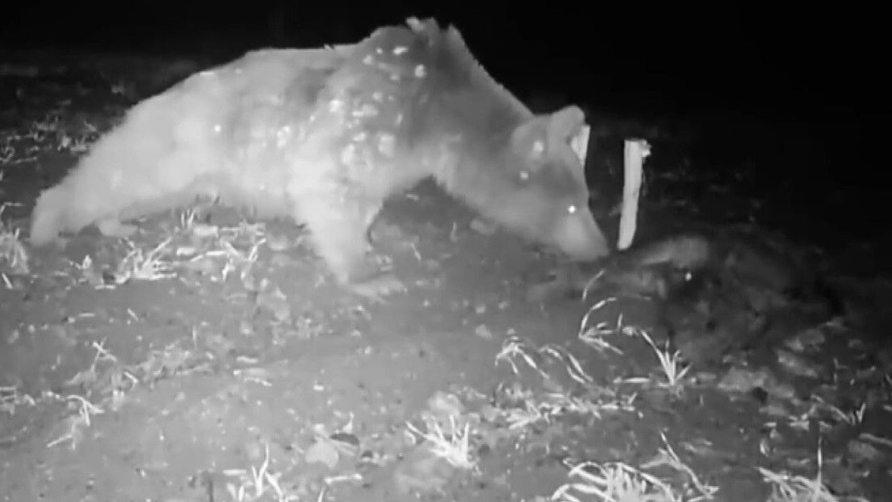 Erzincan’da domuz leşiyle karnını doyuran boz ayı fotokapanla görüntülendi.