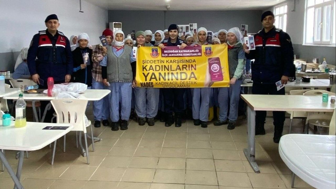 Aydın İl Jandarma Komutanlığı koordinesinde kadına yönelik şiddet ve KADES uygulaması konularında bilgilendirme çalışmaları aralıksız sürüyor. Bu çerçevede Bozdoğan İlçe Jandarma Komutanlığı ekipleri, bir işletmede çalışan kadınlarla bir araya geldi. Kadın çalışanlara 6284 Sayılı Kanun, başvuru mercileri, KADES ve Kadına El Kalkamaz konuları kapsamında tanıtım ve bilgilendirme yapıldı. Ayrıca farkındalığını arttırmak ve bilinç kazandırmak amacıyla KADES ve Kadına El Kalkamaz pankartı açılarak KADES Uygulaması telefonlara yükletildi.