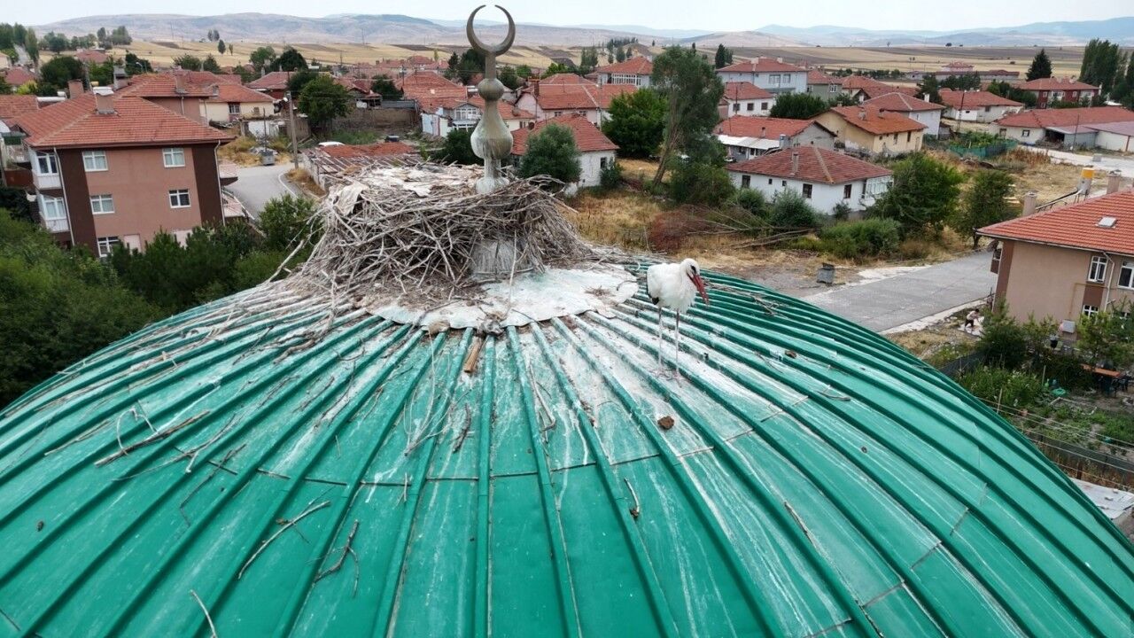 Çankırı’nın Orta ilçesinde bulunan bir caminin kubbesi, yıllardır leyleklere ev sahipliği yapıyor.
