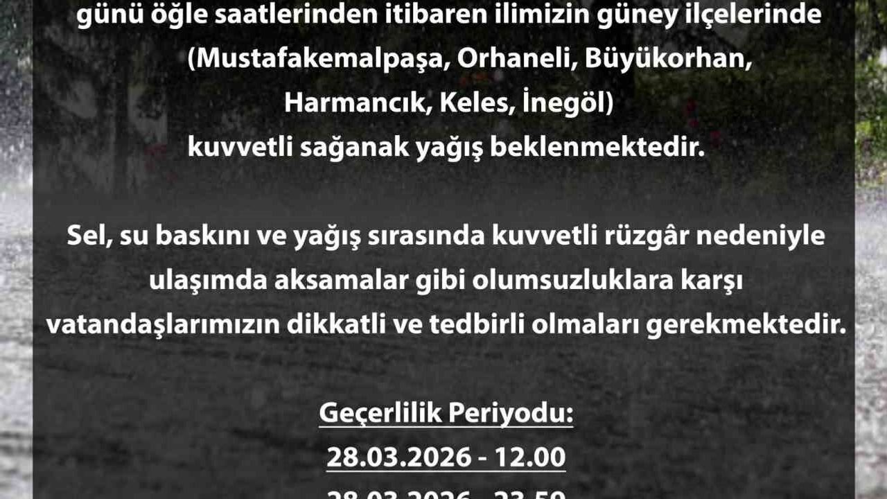 Bursa Valiliğinden yapılan açıklamada, Mustafakemalpaşa, Orhaneli, Büyükorhan, Harmancık, Keles ve İnegöl ilçelerinde kuvvetli sağanak yağış beklendiği belirtilerek, muhtemel risklere karşı tedbirli olunması gerektiği vurgulandı. Yetkililer, yağış nedeniyle sel, su baskını, kuvvetli rüzgâr ve buna bağlı olarak ulaşımda yaşanabilecek aksamalar gibi olumsuzluklara karşı vatandaşların gerekli önlemleri almasını istedi. Uyarının 28 Mart Cumartesi günü saat 12.00 ile 23.59 arası için geçerli olduğu bildirildi. Yetkililer, gelişmelerin takip edilmesi ve resmi uyarıların dikkate alınmasının önemine dikkat çekti.
