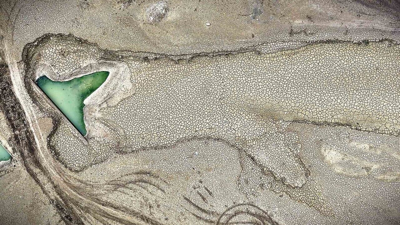 Dronla kaydedilen görüntülerde, iki baraj göletinde de suyun büyük oranda çekildiği, bazı noktalarda çekilmenin 300 metreyi bulduğu ve zeminde derin çatlakların oluştuğu görülüyor.