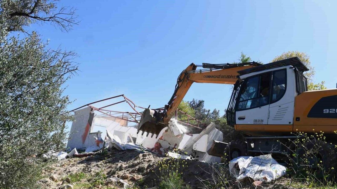 Bursa’da imara aykırı şekilde inşa edildiği belirlenen bina, inşaat temeli ve çevre duvarı olmak üzere 25 kaçak yapı yıkıldı.