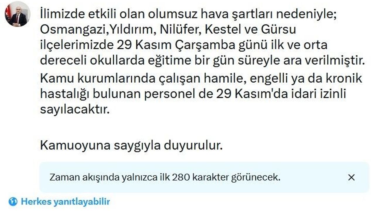 Bursa Valisi Mahmut Demirtaş tarafından yapılan açıklamada, “İlimizde etkili olan olumsuz hava şartları nedeniyle; Osmangazi, Yıldırım, Nilüfer, Kestel ve Gürsu ilçelerimizde 29 Kasım Çarşamba günü ilk ve orta dereceli okullarda eğitime bir gün süreyle ara verilmiştir. Kamu kurumlarında çalışan hamile, engelli ya da kronik hastalığı bulunan personel de 29 Kasım’da idari izinli sayılacaktır. Kamuoyuna saygıyla duyurulur” ifadelerine yer verildi.