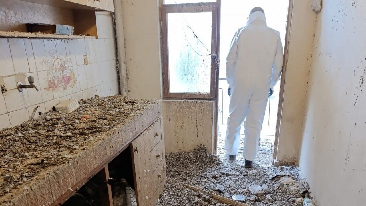 Evin cam ve kapılarının uzun süredir açık olduğu, odaların kuşlarla dolduğu ve dairenin adeta kümese döndüğü görüldü. Temizlik sonrası ekipler evde ilaçlama ve dezenfekte çalışması gerçekleştirdi.