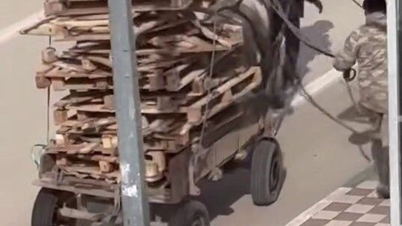 Bursa'nın Karacabey ilçesinde kimliği henüz öğrenilemeyen bir kişi, at arabasına kat kat palet yükledi. Aşırı yük nedeniyle yükün ağırlığı altında güçlükle ilerleyen atın dengesini sağlamakta zorlandığı anlar, çevrede bulunan bir vatandaş tarafından cep telefonu kamerasıyla kaydedildi.