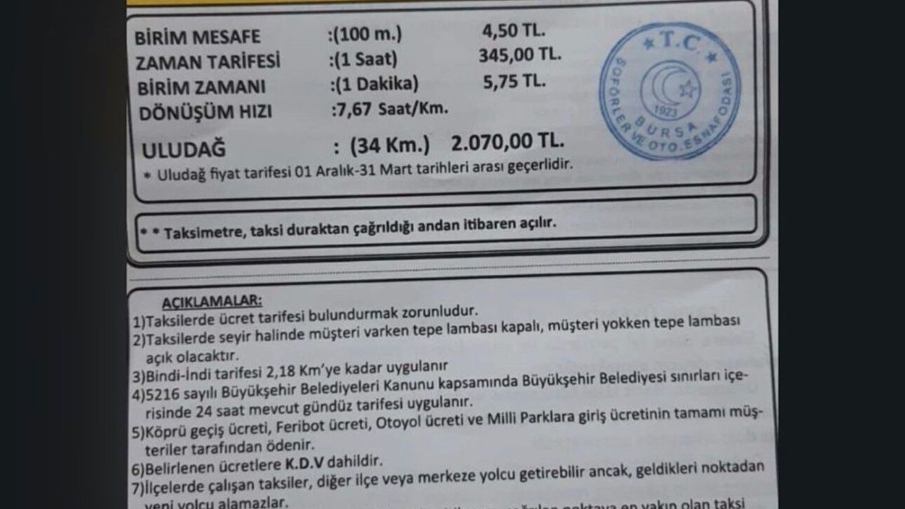 Bursa Şoförler ve Otomobilciler Esnaf Odası tarafından belirlenen yeni tarifede kısa mesafe olarak bilinen indi-bindi ücreti ise 150 TL'ye yükseltildi. Tarifeye göre 100 metre için ücret 4,50 TL olarak hesaplanırken, 1 saatlik zaman tarifesi 345 TL oldu. Dakika başına bekleme ücreti ise 5,75 TL olarak uygulanacak.