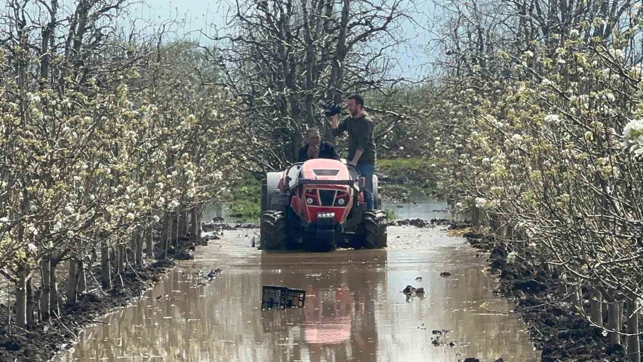 Armut bahçesine ilaçlama yapan üretici Turgay Koç ise yaşadıklarına zorluğa dikkati çekerek, 'Traktörlere, bize, çiftçiye, meyve ağaçlarına yazık. 9 dönüm armut bahçemin büyük bölümü su altında. Bir hafta 10 gün su çekilmezse kurayacak. Önümüzdeki günler de yağışlı görünüyor, çaresisiz' diye konuştu.