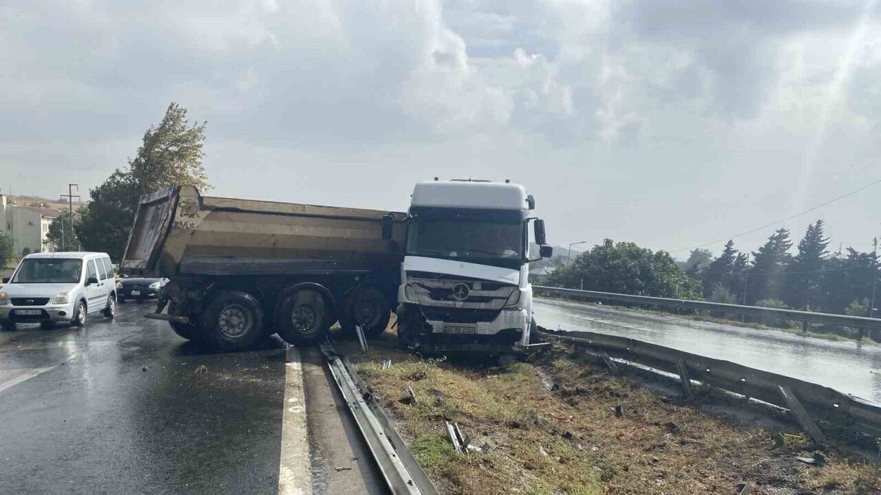Büyükçekmece E-5 Güzelce mevkiinde şiddetli yağış nedeniyle kayganlaşan yolda kontrolden çıkan hafriyat kamyonu, bariyerleri aşarak ters istikamete döndü. Facianın eşiğinden dönülen kazada ölen ya da yaralanan olmazken, kaza anı güvenlik kamerasına yansıdı.