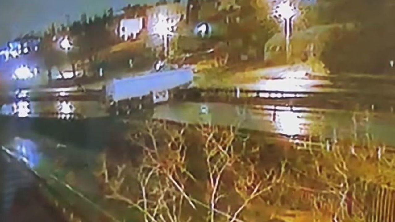 İstanbul Büyükçekmece’de yağmurda kayganlaşan yolda kayan tır bariyere çarparak ters döndü. O anlar güvenlik kamerasınca kaydedildi.