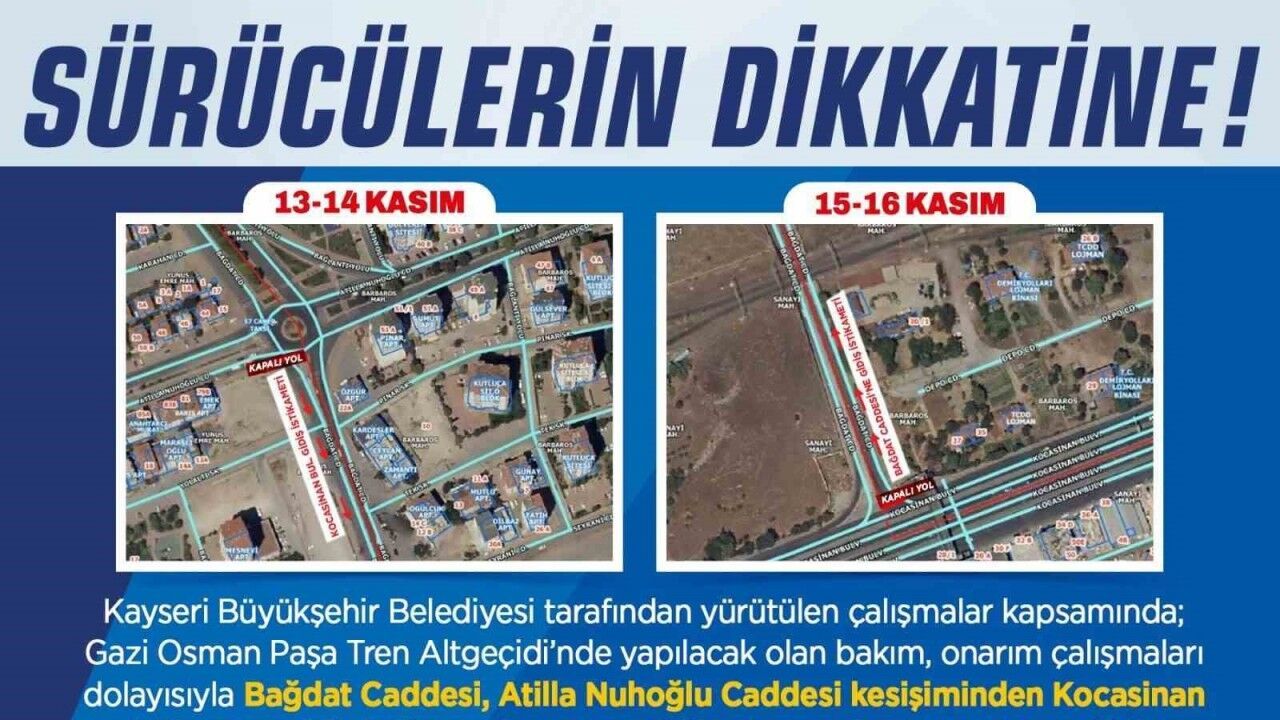 Kayseri Büyükşehir Belediyesi tarafından yapılan uyarıda, "Kayseri Büyükşehir Belediyesi tarafından yürütülen çalışmalar kapsamında; Gazi Osman Paşa Tren Altgeçidi’nde yapılacak olan bakım, onarım çalışmaları dolayısıyla Bağdat Caddesi, Atilla Nuhoğlu Caddesi kesişiminden Kocasinan Bulvarı’na gidiş istikameti 13 Kasım 2025 Perşembe ve 14 Kasım 2025 Cuma günleri, saat 09.00 ile 16.00 arasında, Kocasinan Bulvarı’ndan Bağdat Caddesi, Atilla Nuhoğlu Caddesi kesişimine kadar olan gidiş istikameti ise 15 Kasım 2025 Cumartesi ve 16 Kasım 2025 Pazar günleri saat 09.00 ile 16.00 arasında taşıt trafiğine kapatılacaktır" ifadelerine yer verildi.