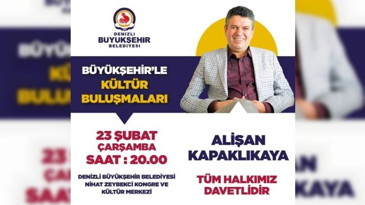 Denizli Büyükşehir Belediyesi, Büyükşehir ile Kültür Buluşmaları programı kapsamında Türkiye’nin önde gelen isimlerini Denizlililerle buluşturmaya devam ediyor. Denizli Büyükşehir Belediyesi İle Kültür Buluşmaları programı kapsamında ikinci konuk sevilen kişisel gelişimci, eğitimci-yazar Alişan Kapaklıkaya olacak. 23 Şubat 2022 Çarşamba günü saat 20.00’de Büyükşehir Belediyesi Nihat Zeybekci Kongre ve Kültür Merkezi Özay Gönlüm Salonu’nda gerçekleşecek. Siyah Pantolon, Aramızda Kalsın, Sevgi Bahçesinin Bahçıvanı, Yüreğime Dokunan Eller, Kendini Yeniden Başlat, Asla Vazgeçmedim, Sen Hiç Kendini Yaşadın mı? adlı milyonları derinden etkileyen kitaplarının yanı sıra katıldığı TV programlarında anlattığı hikaye ve anekdotlarla geniş kitlelerin tanıdığı isim olan eğitimci yazar Kapaklıkaya, aile ilişkileri ve iletişim sorunlarına ışık tutacak.
