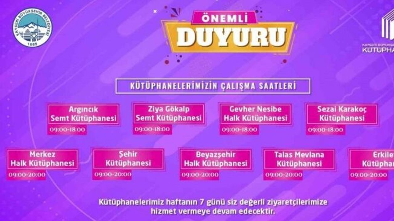Kayseri Büyükşehir Belediyesi’ne ait kütüphanelerde çalışma saatleri yeniden düzenlendi. Belediye bağlı kütüphanelerde haftanın 7 günü hizmet vermeye devam ediyor.