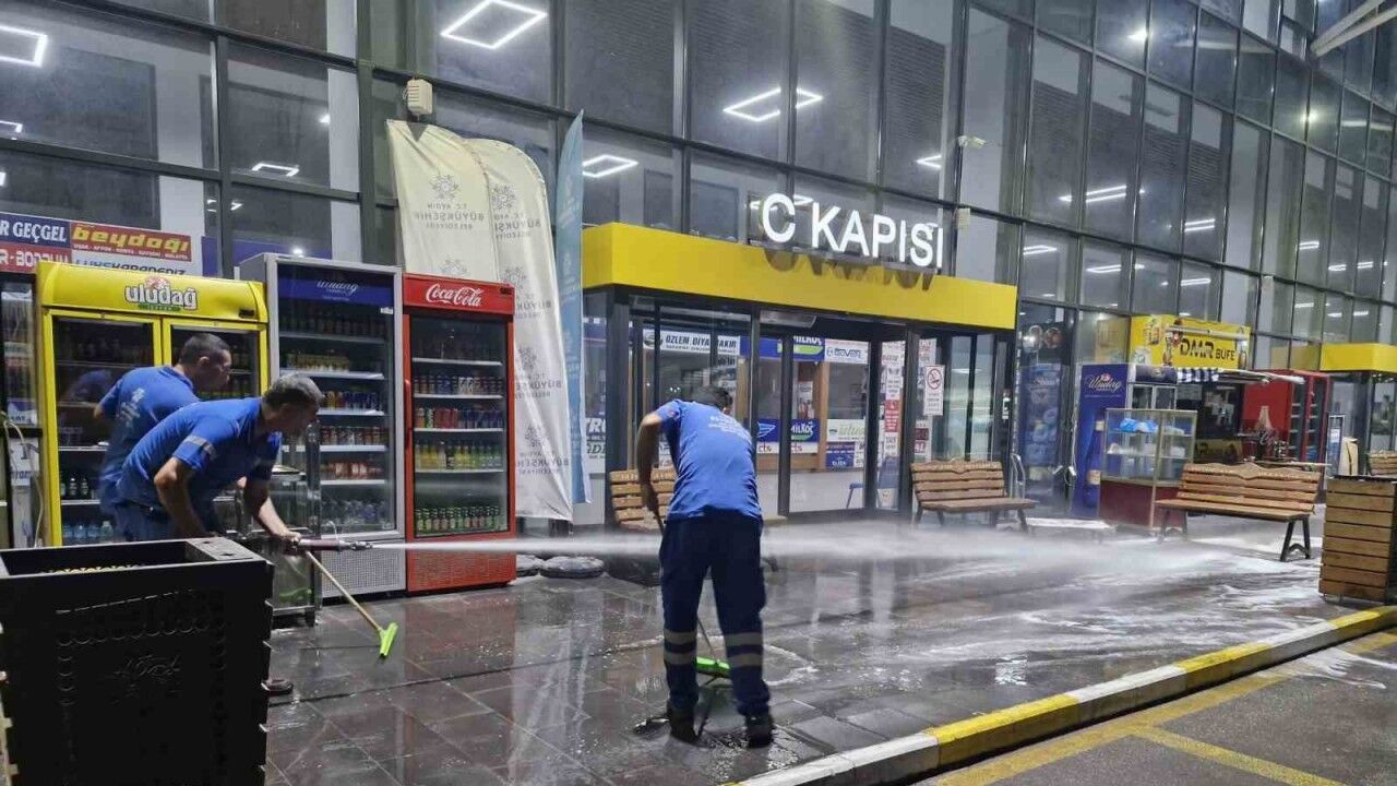 Bayram tatilini geçirmek üzere turizmin ve tarihin kenti Aydın’a gelen vatandaşların yoğunluk oluşturduğu otogarlarda gece saatlerinde temizlik çalışması gerçekleştirildi. Büyükşehir Belediyesi Çevre Koruma ve Kontrol Dairesi Başkanlığı ekipleri tarafından gerçekleştirilen temizlik çalışması kapsamında Şehirler Arası Otobüs Terminali temiz hale geldi.