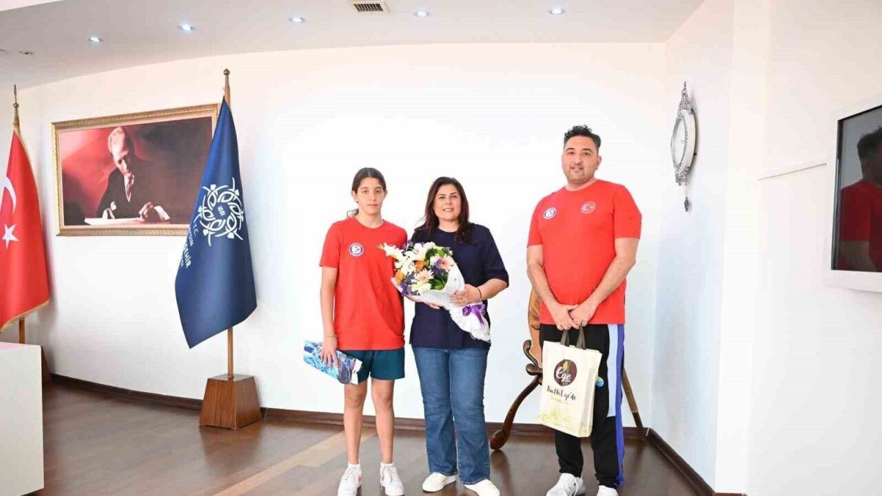 Aydın Büyükşehir Belediyesi Atatürk Spor Kompleksi’nde gerçekleştirilen eğitimler ile milli takıma giren genç yüzücü Nisan Ada Balkan, Büyükşehir Belediye Başkanı Özlem Çerçioğlu’nu makamında ziyaret etti.