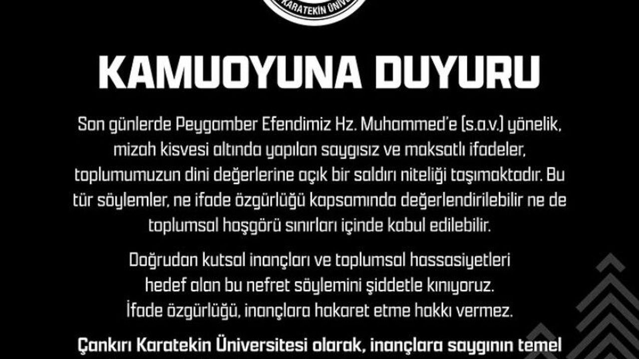 Açıklamada, "Son günlerde Peygamber Efendimiz Hz. Muhammed’e (s.a.v.) yönelik, mizah kısıvesi altında yapılan saygısız ve maksatlı ifadeler, toplumumuzun dini değerlerine açık bir saldırı niteliği taşımaktadır. Bu tür söylemler, ne ifade özgürlüğü kapsamında değerlendirilebilir ne de toplumsal hoşgörü sınırları içinde kabul edilebilir. Doğrudan kutsal inançları ve toplumsal hassasiyetleri hedef alan bu nefret söylemini şiddetle kınıyoruz. İfade özgürlüğü, inançlara hakaret etme hakkı vermez. Çankırı Karatekin Üniversitesi olarak, inançlara saygının temel bir insan hakkı olduğunu hatırlatıyor; dini ve toplumsal değerlerimizi hedef alan her türlü provokatif girişim karşısında durduğumuzu kamuoyuna saygıyla bildiriyoruz" ifadelerine yer verildi.