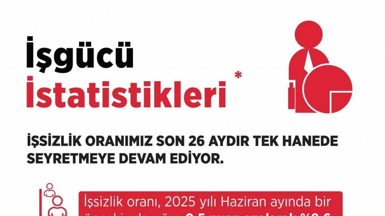 Çalışma ve Sosyal Güvenlik Bakanlığı, Türkiye İstatistik Kurumu (TÜİK) 2025 yılı Haziran ayı işgücü istatistiklerine ilişkin açıklama yaptı. Son 26 aydır işsizlik oranının tek hanelerde olduğu vurgulanan açıklamada, şu ifadelere yer verildi: