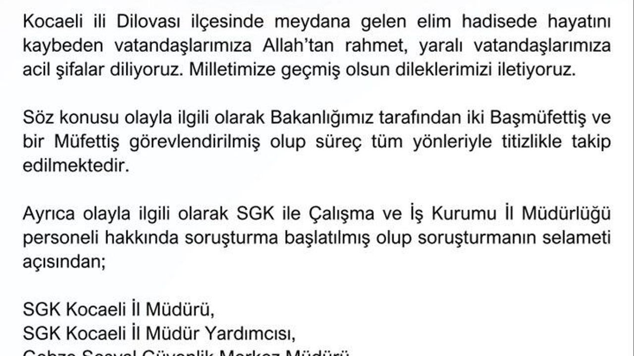 7 kişinin açığa alındığı belirtilen açıklamada, "Ayrıca olayla ilgili olarak SGK ile Çalışma ve İş Kurumu İl Müdürlüğü personeli hakkında soruşturma başlatılmış olup, soruşturmanın selameti açısından SGK Kocaeli İl Müdürü, SGK Kocaeli İl Müdür Yardımcısı, Gebze Sosyal Güvenlik Merkez Müdürü, Çalışma ve İş Kurumu Kocaeli İl Müdürü, İŞKUR Dilovası Hizmet Merkezi Müdürü, İŞKUR CİMER’den Sorumlu Şube Müdürü ve bir personel açığa alınmıştır. Kamuoyunun doğru bilgilendirilmesi adına sürecin her aşaması dikkatle takip edilmekte ve gerekli tüm adımlar atılmaktadır" denildi.