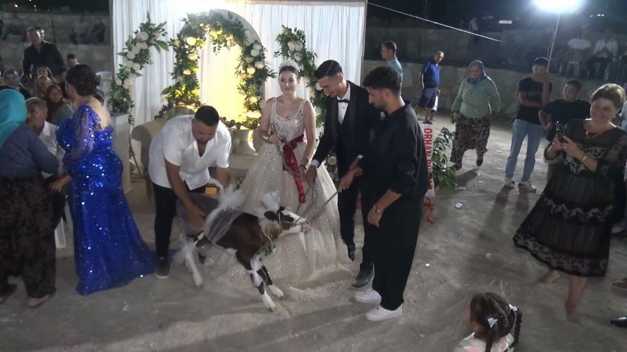 Çanakkale’nin Ayvacık ilçesinde düğün hediyesi olarak çifte, buzağı hediye edildi.