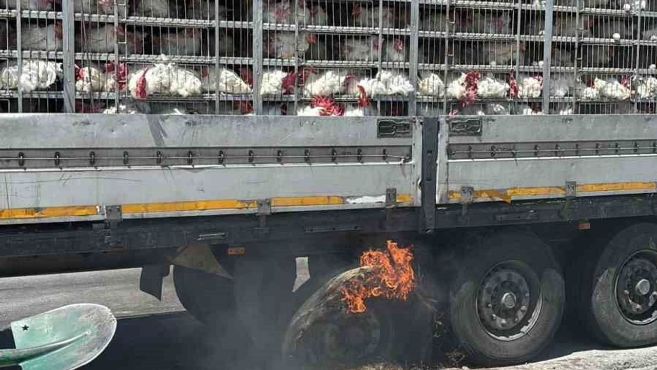Konya’nın Karapınar ilçesinde canlı tavuk dolu tırın dorse lastiklerinde çıkan yangın paniğe neden oldu.