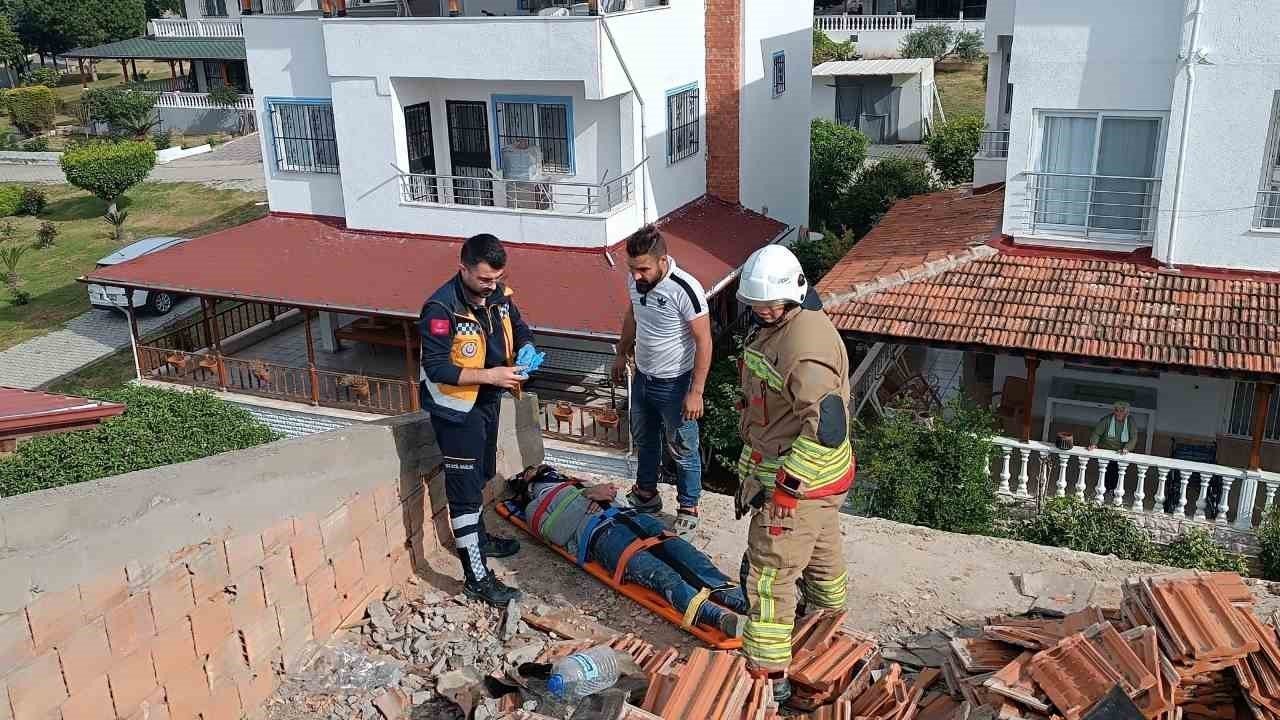Hatay'da çatıda çalışırken üzerine su deposu devrilerek yaralanan işçi, itfaiye merdiveniyle indirilip sağlık ekiplerine teslim edildi.