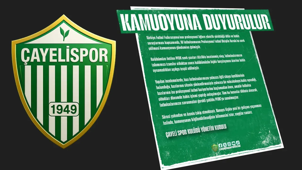 Türkiye Futbol Federasyonu’nun (TFF) profesyonel liglere yönelik yürüttüğü iddia ve bahis soruşturması kapsamında, Çayelispor’dan 10 futbolcunun Profesyonel Futbol Disiplin Kurulu’na (PFDK) sevk edilmesi üzerine kulüpten resmi açıklama yapıldı.