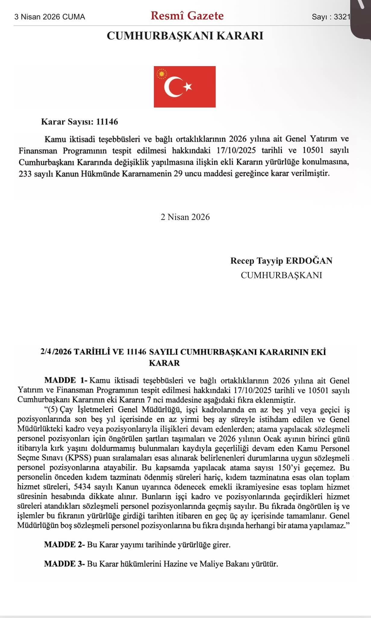 40 yaş ve KPSS şartı aranan şartı aranan düzenleme ile ilgili Resmi Gazete’de yayınlanan 2/4/2026 Tarihli Ve 11146 sayılı Cumhurbaşkanı kararının Eki Karar şöyle
