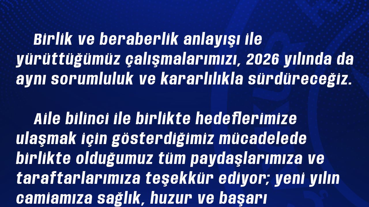 Değerli ve Büyük Çaykur Rizespor Ailesi'ne seslenen Kulüp Başkanı İbrahim Turgut, birlik ve beraberlik ruhuyla sürdürülen çalışmaların 2026 yılında da aynı kararlılıkla devam edeceğini belirtti.