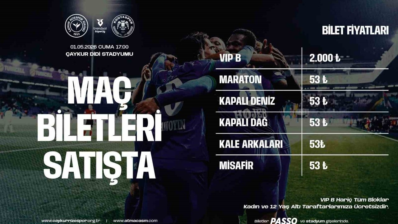 Trendyol Süper Lig 32. Haftasında Çaykur Rizespor kendi sahasında Konyaspor ile karşı kaşıya gelecek. 1 Mayıs Cuma günü saat 17.00'de oynanacak mücadele öncesinde açıklanan bilet fiyatlarında, Rize'nin plaka kodu olan '53' detayı dikkat çekti. VİP haricindeki alanlar olan Maraton, kapalı, kale arkası ve misafir tribünü biletleri 53 TL'den satışa sunuldu. Karşılaşmanın VIP B tribünü bilet fiyatı ise 2 bin TL olarak açıklandı.