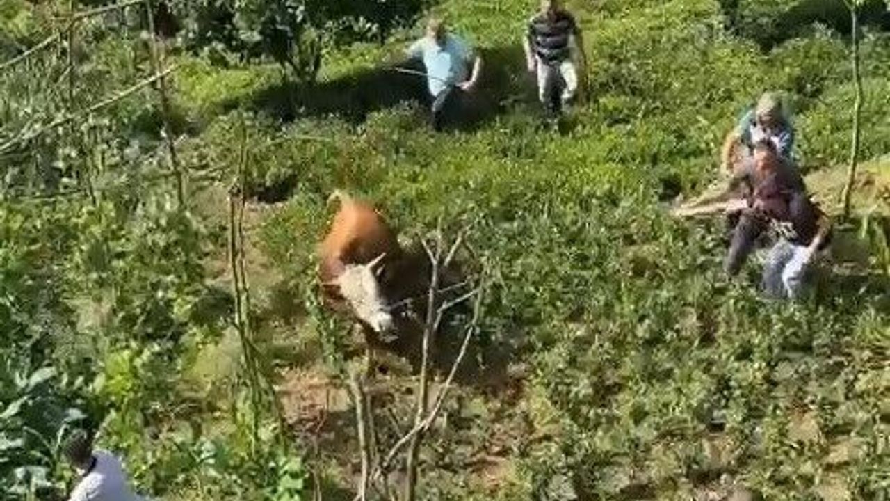 Haber:Arzu Erbaş/Rize'nin İyidere ilçesinde sahiplerinin elinden kaçan boğa zor anlar yaşattı.Kalecik Köyünde sabah saatlerinde kesilmek için alana çıkarılan boğa ipinden kurtularak kaçmaya başladı.Kurban sahiplerinin çay bahçesinde sıkıştırmaya çalıştığı kurbanlık zaman zaman vatandaşların üzerine koşarak korku dolu anlar yaşattı. Ekiplere haber verilmesi ile olay yerine gelen kurban yakalama timi uyuşturucu iğne atarak kurbanlığı sakinleştirdi. Sahiplerinin tekrar yakalamayı başardığı kurbanlık kesime gitti.