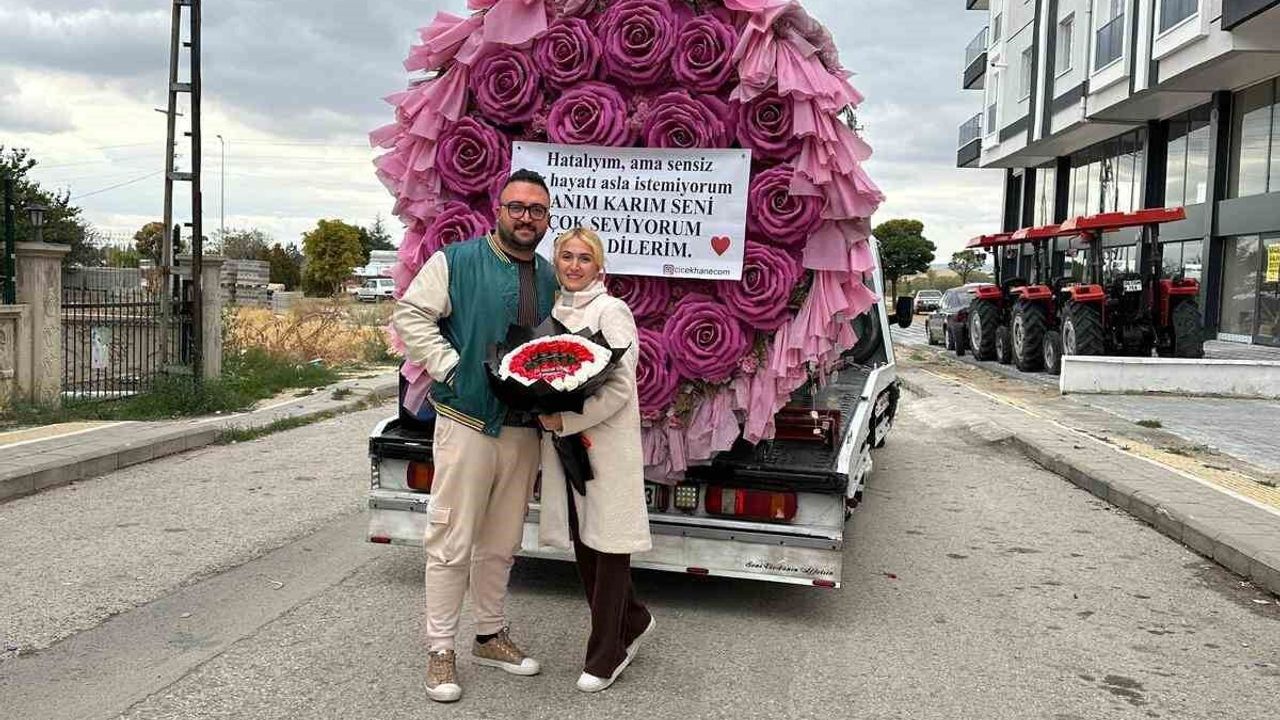Ankara’nın Akyurt ilçesinde bir vatandaş, eşinden özür dilemek için çekiciyle dev bir çiçek gönderdi.