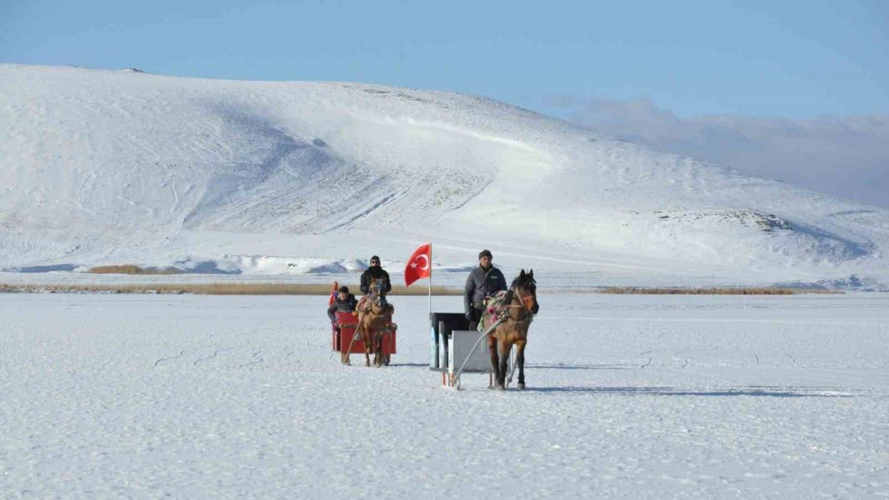 Aslan, "Çıldır gölü buz tuttu. 15-20 santim aralığında buz kalınlığımız var. Atlarımızı çıkardık, atlı kızaklarla gezinti yapıyoruz. Kar motorlarımız, atlı kızaklarımız hepsi gölün üzerinde gelen misafirlerimizi Mart ayına kadar ağırlamaya çalışacağız" diye konuştu.