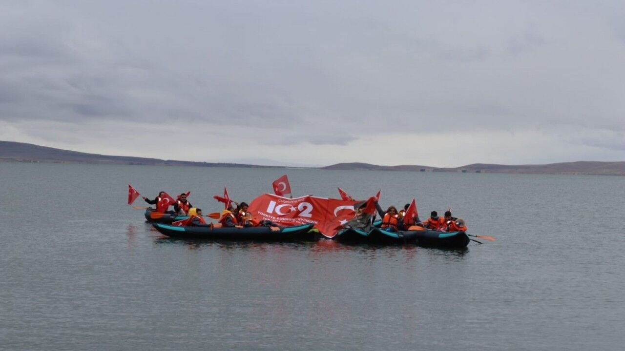 Kanolarıyla göl üzerinde gösteri yapan çocuklar, ellerinde Türk bayrakları ve Azerbaycan bayrakları ile Gazi Mustafa Kemal Atatürk’ün posterini açarak, Çıldır Gölü üzerinden Cumhuriyetin kurucusu Atatürk’ü selamladılar.