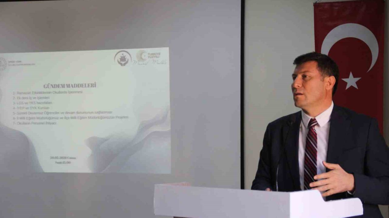 Milli Eğitim Müdürlüğü toplantı salonunda gerçekleşen buluşmada akademik başarının artırılması, öğrencilerin sosyal ve ahlaki gelişimlerinin desteklenmesi, devamsızlıkla mücadele, okul güvenliği, ölçme ve değerlendirme uygulamaları ile devam eden projelerin etkinliği ele alındı. Okullarda eğitim kalitesinin sürdürülebilir şekilde yükseltilmesine yönelik planlamalar yapıldı.