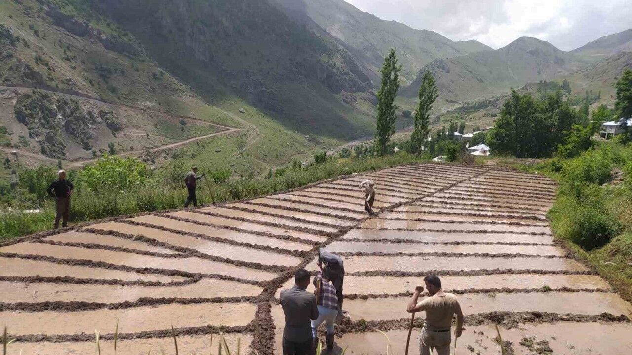 Hakkari’nin Çukurca ilçesine bağlı Akkaya köyündeki çiftçiler, imece usulü çeltik ekimine başladı.