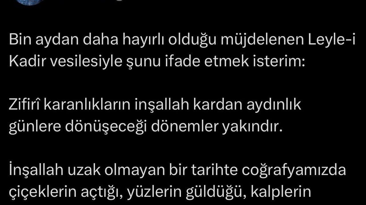 Cumhurbaşkanı Erdoğan, Kadir Gecesi dolayısıyla sosyal medya hesabından yaptığı paylaşımda, 'Zifirî karanlıkların inşallah kardan aydınlık günlere dönüşeceği dönemler yakındır' ifadelerini kullanarak barış ve huzur temennisinde bulundu.