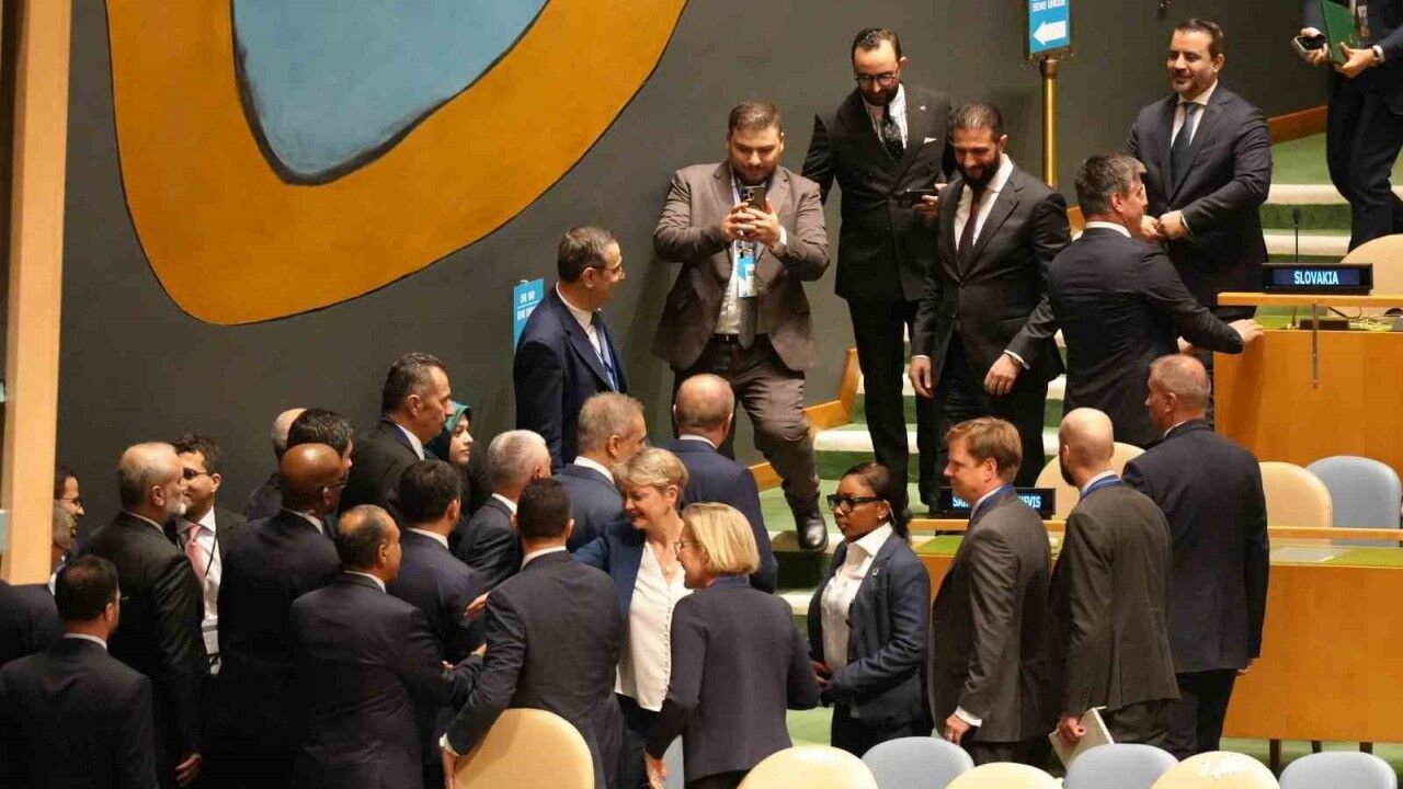 Cumhurbaşkanı Recep Tayyip Erdoğan, BM 80. Genel Kurulu’na katılmak üzere geldiği New York’ta temaslarını sürdürüyor. Erdoğan, New York’taki temaslarının ikinci gününde Filistin Meselesine Çözüm Bulunması ve İki Devletli Çözümün Hayata Geçirilmesi Konulu Yüksek Düzeyli Uluslararası Konferans’a katılmak üzere Türkevi’nden ayrılarak BM Genel Merkezi’ne geldi. Kalabalık bir heyetin de eşlik ettiği Cumhurbaşkanı Erdoğan, BM salonunda Suriye Devlet Başkanı Ahmed eş-Şara ile ayaküstü kısa bir süre sohbet etti.