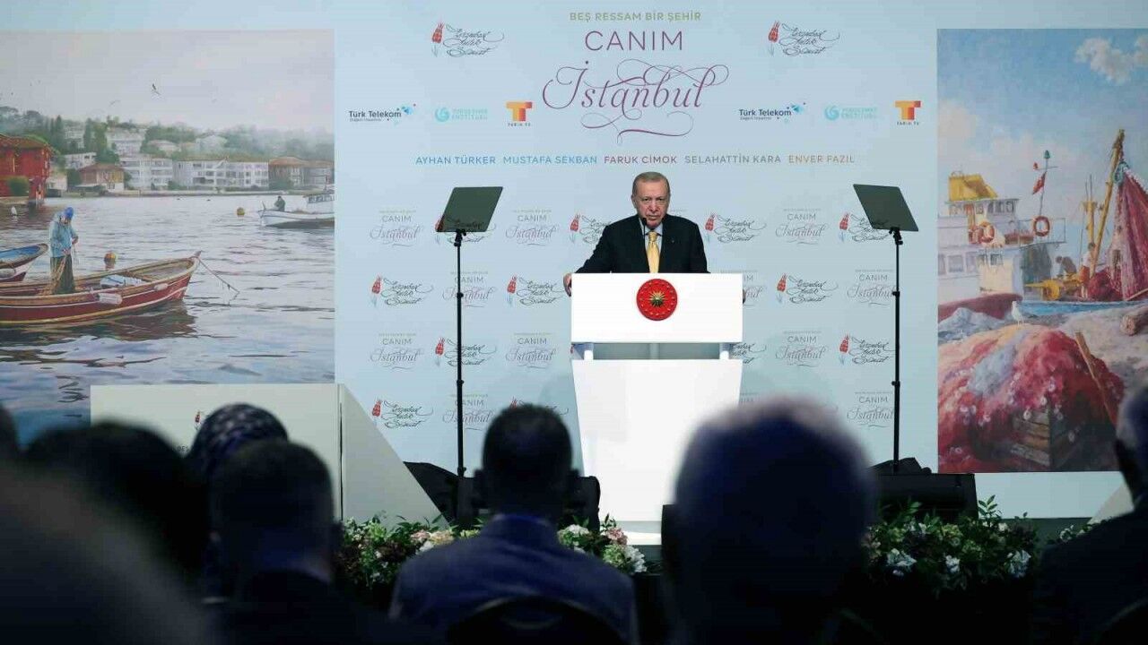 Cumhurbaşkanı Recep Tayyip Erdoğan Lütfi Kırdar Kongre ve Sergi Sarayı’nda düzenlenen "Beş Ressam Bir Şehir Canım İstanbul Programı"nda bir konuşma yaptı. Cumhurbaşkanı Erdoğan serginin, İstanbul’un eşsiz güzelliklerini ve zengin dokusunu bir araya getirdiğini söyleyerek, "Osmanlı’da sadrazamlık da yapmış diplomat ve şair merhum Koca Ragıp Paşa 3 asır önce kaleme almış beytini şu mısra ile hafızalara kazınmıştı. ’Eğer maksud eserse, mısra-i berceste kafidir’. Buradaki her bir çalışmayı tüm bir kompozisyonuyla ahenkli bir şiiri andıran İstanbul’un en güzel mısraları olarak gördüğümü ifade etmek isterim. İstanbul’da yaşayan sanatseverlerin 16 Eylül’e kadar büyük emek verilen bu sergiyi zaten ziyaret edeceklerdir. Diğer illerimizdeki İstanbul aşıklarının da bu sanat şölenini bizzat yerinde gelip göreceklerine inanıyorum. Sanata ve İstanbul’a gönül veren tüm kardeşlerimi sergiyi ziyaret etmeye davet ediyorum. Evvelemirde şu hakikatin altını çizmemiz gerektiği kanaatindeyim. Bin yıldır üzerinde özgürce yaşadığımız, inşallah kıyamete kadar da milletimizin ana yurdu olacak bu aziz topraklar, dünyanın en eski medeniyetlerine ev sahipliği yapmıştır. Bu medeniyetler felsefeden mimariye, bilimden sanata, siyasetten hukuka hemen her alanda tüm ürünlerini önce bu coğrafyada vermiştir. Anadolu’da üretilen eserler, burada oluşan değerler asırlar boyunca halka halka önce etrafına ardından tüm cihana yayılmıştır. Bin yıllara sari bu sürece biz de millet olarak son derece önemli katkılar yaptık. İnancımızla, dilimizle, geleneğimizle, motiflerimizle, ilmi ve kültürel hazinemizle insanlığa pek çok değer kazandırdık. Kimliğimizi teşkil eden, ruh köklerimizi besleyen ne kadar unsur varsa hepsini de sanatımıza ve eserlerimize yansıtmayı, aktarmayı, dercetmeyi başardık. Bakınız, merhum Ahmet Hamdi Tanpınar 1932 yılında, yani bundan tam 93 sene önce verdiği bir mülakatta sanatın amacını nasıl tarif ediyor, ’Sanatın gayesi güzelliktir. Güzellik bir kemaldir. Sanatın malzemesi de bu kemali nakşetmeye çalışır’ Millet olarak bu anlayışla sanatı iyiye, güzele, hakka ve hakikate giden yolun köşe taşları olarak gördük. Eserlerimize daima bu hikmetli kavrayışla baktık. Üslubumuzu yine buna göre belirledik" dedi.