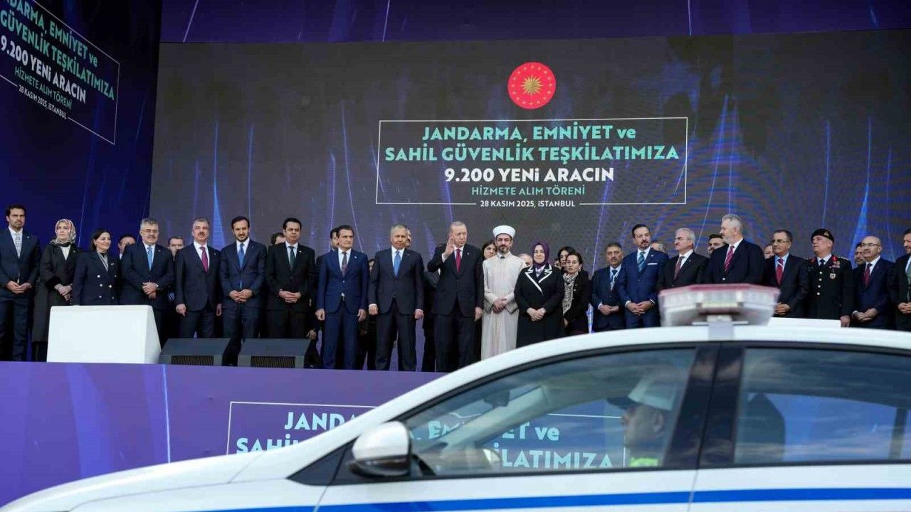Cumhurbaşkanı Recep Tayyip Erdoğan, Atatürk Havalimanı’nda Jandarma, Emniyet ve Sahil Güvenlik Teşkilatı için 9 bin 200 yeni aracın hizmete alım törenine katıldı. Cumhurbaşkanı Erdoğan burada bir konuşma yaptı. Konuşmasına Emniyet, Jandarma ve Sahil Güvenlik Teşkilatı bünyesinde görev yaparken hayatlarını kaybeden tüm şehitlere rahmet dileyerek başlayan Cumhurbaşkanı Erdoğan, "Aynı ideal uğrunda yaralanan gazilerimize, ülkem ve milletim adına şükranlarımı sunuyor, kendilerine sağlıklı, hayırlı ömürler diliyorum. Rabbim sizleri her türlü kazadan, beladan, saldırıdan, görünür ve görünmez musibetten muhafaza buyursun. Hükümet olarak, güvenlik kuvvetlerimizin vazifelerini en iyi şekilde yerine getirmeleri için gerekli her türlü desteği sağlıyoruz. Envanterlerinde bulunan ve ekonomik ömürlerini tamamlayan araçların yenilenmesi çalışmalarını geçen yıl başlattık. Böylece hem görev araçlarımızın niteliğini hem de vatandaşlarımıza sunulan hizmetlerin etkinliğini artırıyoruz. Geçen sene yine burada yaptığımız törenle Jandarma ve Emniyet teşkilatlarımıza 7 bin 204 yeni aracı kazandırmıştık. Bugün de 9 bin 200 aracı daha resmen sizlerin hizmetine veriyoruz. Bu araçlardan 7 bin 80 tanesi emniyetimiz, 2 bin 70 tanesi jandarmamız, 50 tanesi ise sahil güvenliğimiz tarafından kullanılacak. Sokaklarımızda, mahallelerimizde, köylerimizde gördüğümüz her polisimiz ve jandarmamız ile onların varlığını simgeleyen araçlar, vatandaşlarımıza güven verirken, suçluların yüreğine de korku salıyor. Yeni araçlarımızın, zehir tacirleri ve şehir eşkıyalarıyla mücadele başta olmak üzere güvenlik ve asayiş faaliyetlerimizin başarılı şekilde ifasında sizlere yardımcı olacağına inanıyorum" ifadelerini kullandı.