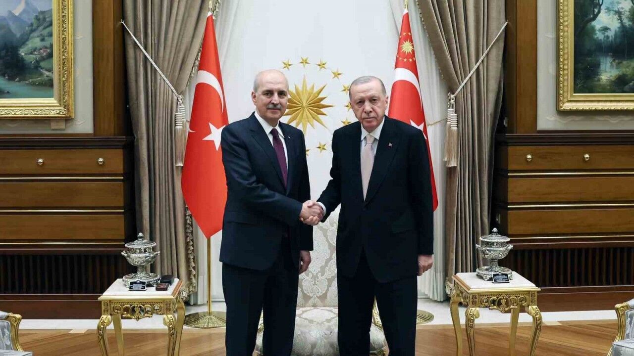 Cumhurbaşkanı Recep Tayyip Erdoğan, Türkiye Büyük Millet Meclisi (TBMM) Başkanlığına yeniden seçilen AK Parti İstanbul Milletvekili Numan Kurtulmuş’u Cumhurbaşkanlığı Külliyesinde kabul etti.