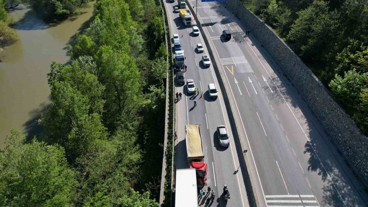 Sakarya'nın Geyve ilçesi D-650 kara yolunda iki çekicinin karıştığı trafik kazası meydana geldi. Kaza nedeniyle Bilecik-Sakarya istikametinde uzun araç kuyrukları oluşurken trafik tek şeritten kontrollü şekilde sağlandı. Oluşan trafik yoğunluğu havadan görüntülendi.