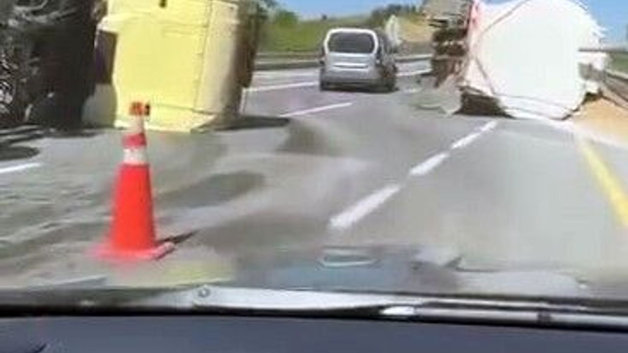 Sakarya’nın Kaynarca ilçesi D020 kara yolunda sürücüsünün kontrolünden çıkan silobas dorse takılı tır devrildi.