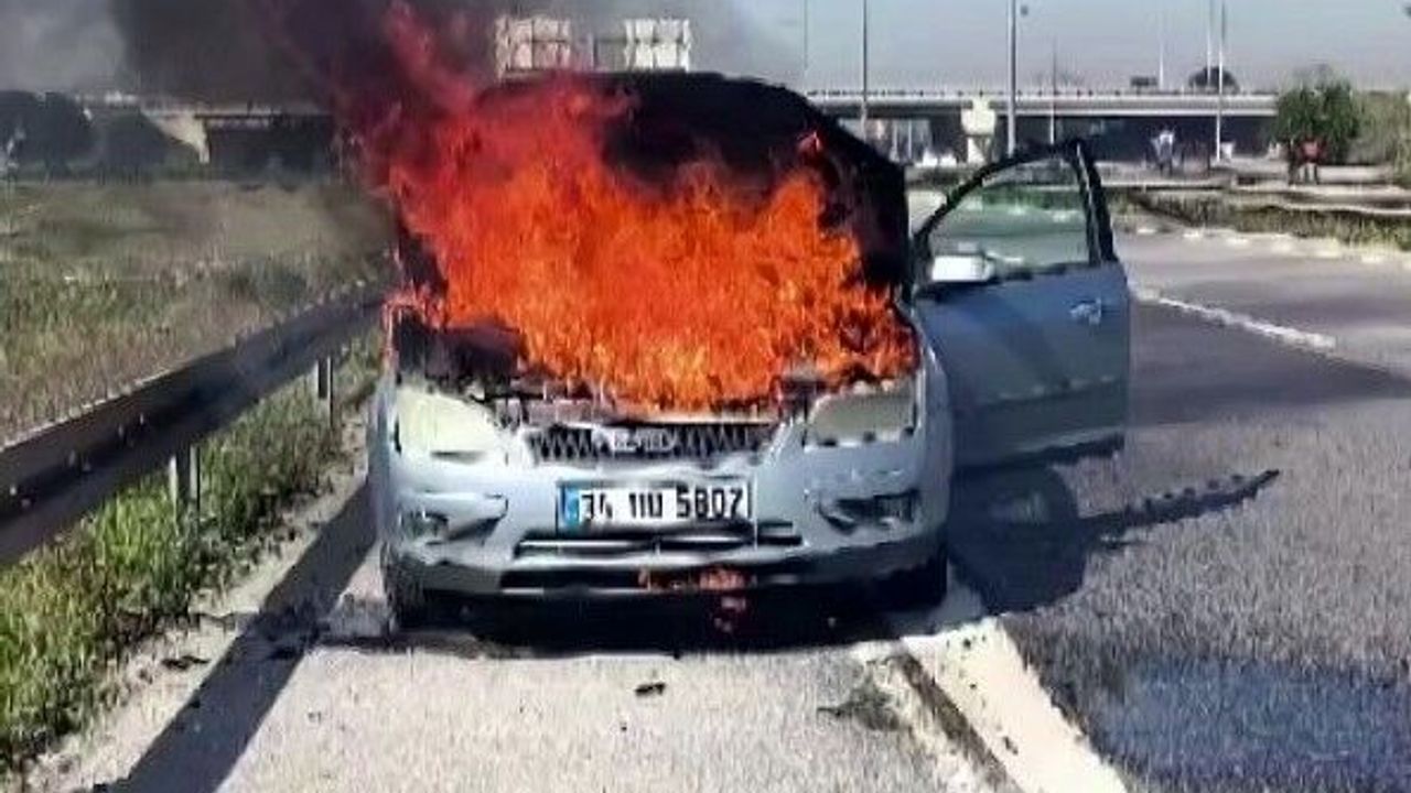 Sakarya’nın Akyazı ilçesi D100 karayolunda seyir halindeki otomobil alev aldı. Dumanları fark ederek aracını emniyet şeridine çeken ve otomobilinin yanışını çaresizce izleyen sürücünün yardımına yoldan geçen diğer sürücüler yetişti.