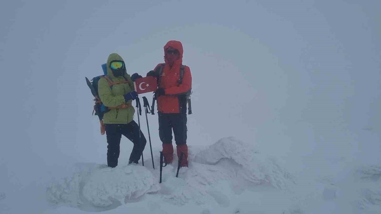 Ağrı'da 2 bin 450 rakımdaki Bubi Dağı zirvesine ulaşan dağcılar, kar ve rüzgâra karşı verdikleri mücadeleyi başarıyla tamamladı.