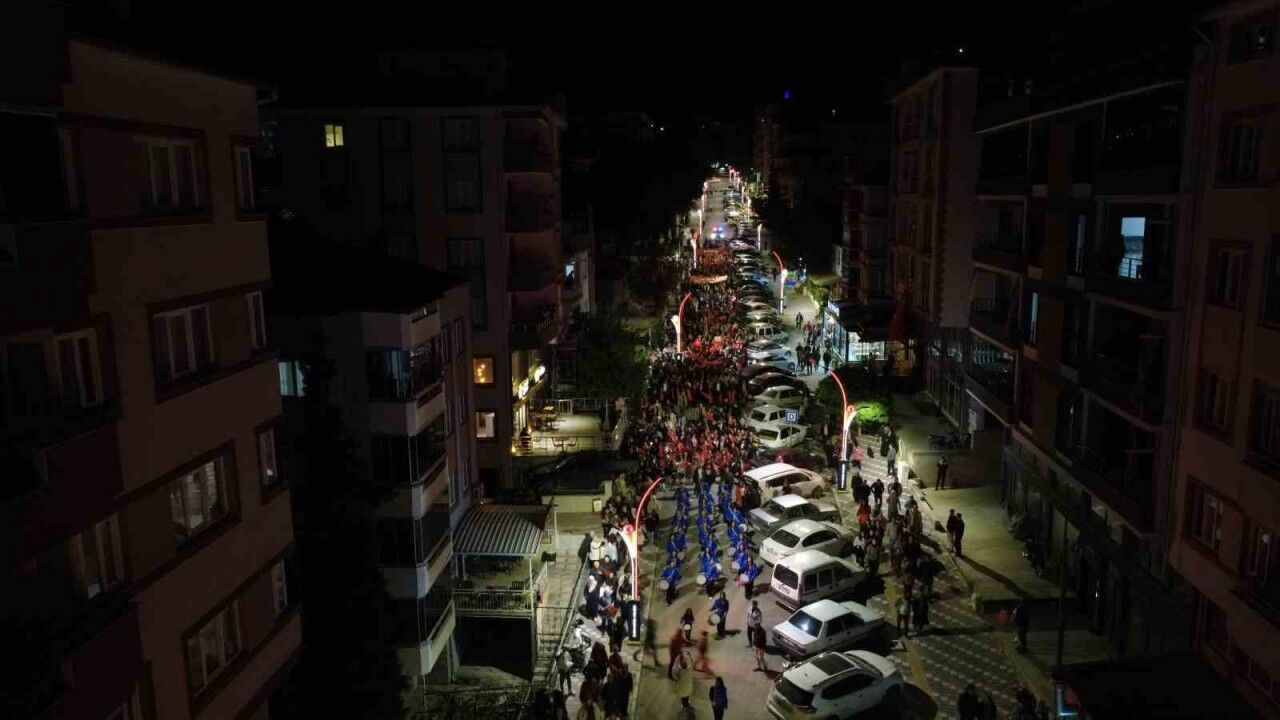 Demirci Prestij Caddesi Hükümet Konağı önünden başlayan fener alayı Gevher Nesibe Mesleki ve Teknik Anadolu Lisesi öğrencilerinden oluşan bando takımı eşliğinde Atatürk anıtına kadar devam etti.