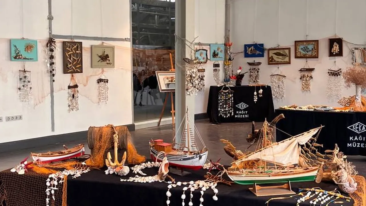 Denizlerin kirletilmesine dikkat çekmek amacıyla hazırlanan sergide, sahillerde bulunan deniz kabuklarının yanı sıra doğadan toplanan kuru ağaç dalları ve geri dönüştürülmüş malzemelerden oluşan çok sayıda özgün eser yer alıyor. Doğal ve atık materyallerin sanata dönüşerek izleyiciyle buluştuğu sergi, sürdürülebilirliğe ve geri dönüşümün önemine de güçlü bir vurgu yapıyor.