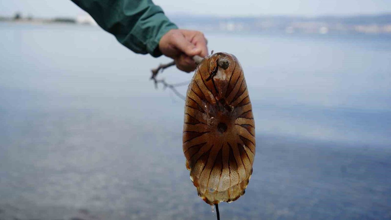 İzmit Körfezi'nde kırmızı rengi ve devasa tentakülleriyle vatandaşları hayrete düşüren pusula denizanası, sayısındaki artışla dikkat çekiyor. Uzmanlar, özellikle tentaküllerine dokunulmamasını, temas halinde deniz suyuyla yıkanmasını ve gerekirse sirke ya da amonyaklı su uygulanmasını öneriyor.