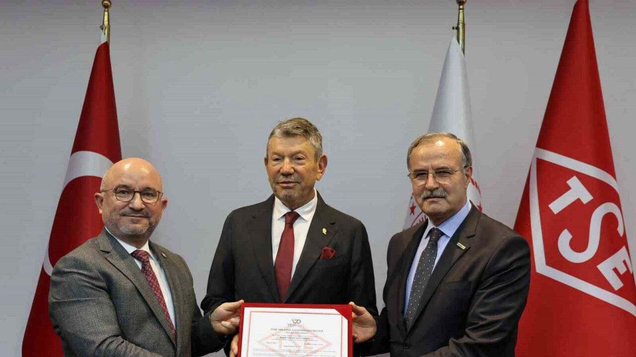 Törende Denizli OSB Yönetim Kurulu Başkanı Derya Baltalı’ya, sertifikayı TSE Başkanı M. Sami Şahin ve OSBÜK Başkanı Memiş Kütükcü takdim etti.