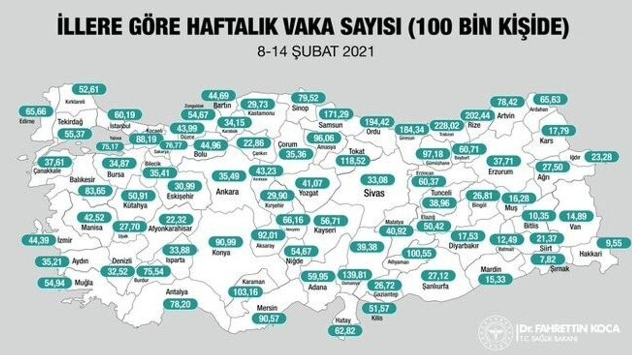 Sağlık Bakanı Dr. Fahrettin Koca, sosyal medya hesabı üzerinden Denizli’de 8 ile 14 Şubat 2021 arasındaki vaka sayısının 100 bin kişiden 32.52’sinin olduğunu açıkladı.